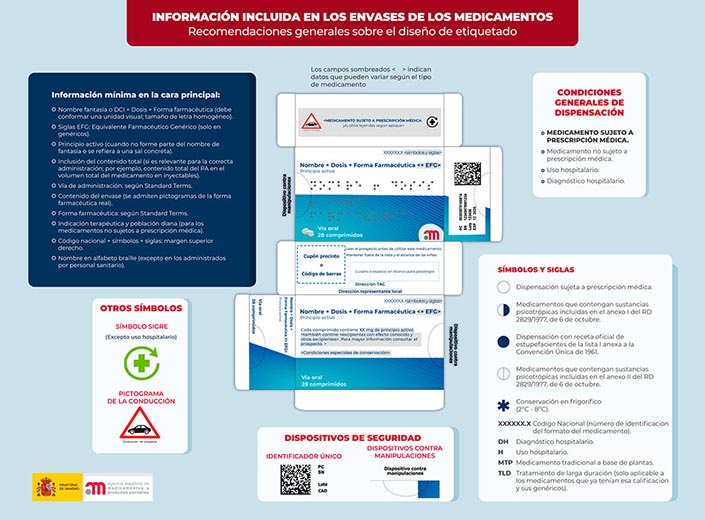 En la siguiente infografía de la Agencia Española de Medicamentos y Productos Sanitarios, se detallan la información y recomendaciones en el diseño del etiquetado de los medicamentos: